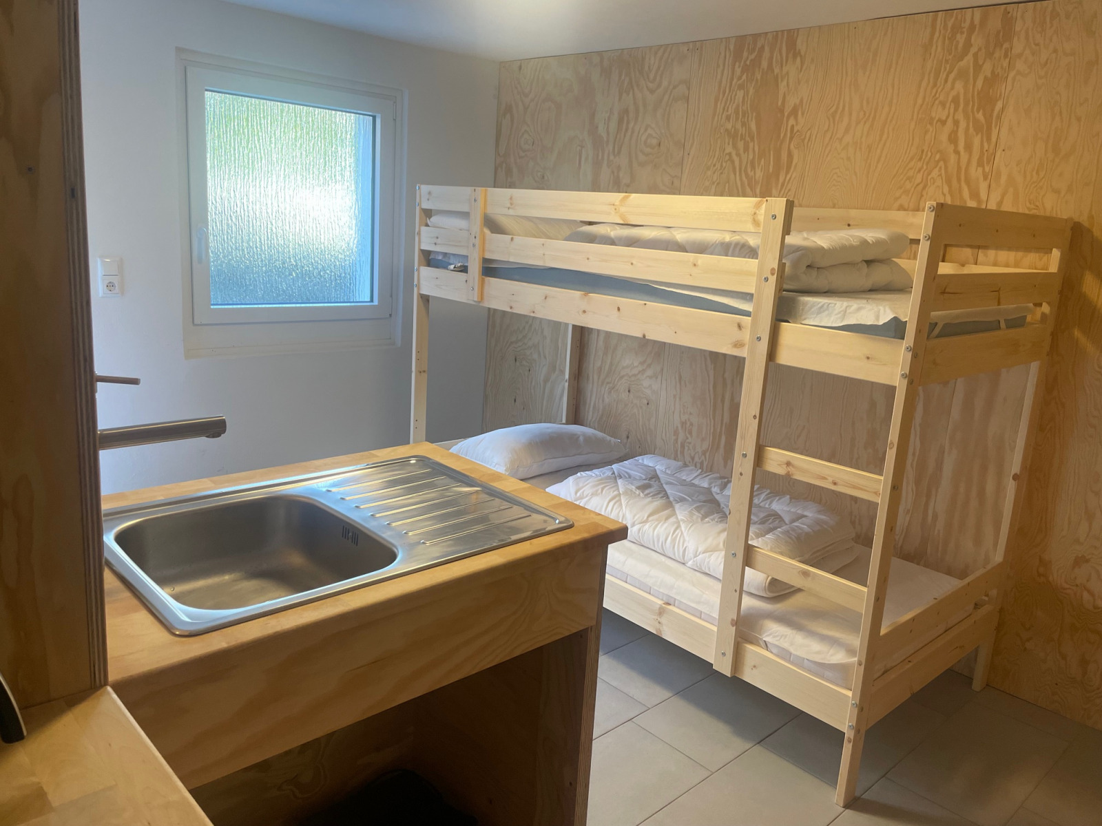 Angedockt an die Wanderhütte, aber ebenfalls mit eigenem Eingang, verfügt unsere Ferienwohnung Nr. 2 über Schlafplätze für 1-2 Personen, ein Duschbad mit WC, sowie eine Miniküche mit Spüle, Wasserkocher und kleinem Kochfeld für einen Topf.